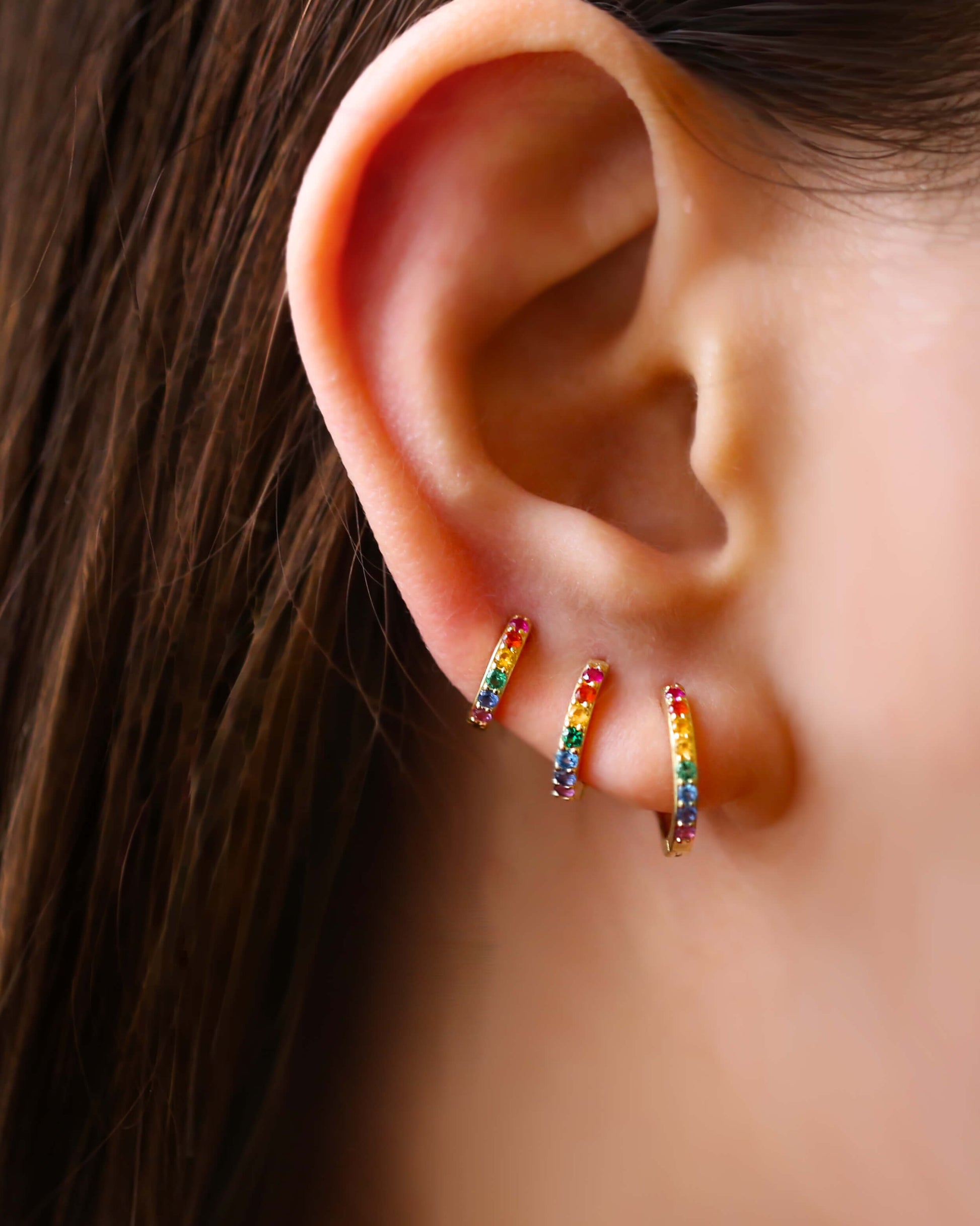 Add a dazzling sparkle to your daily style with our Rainbow Huggie Hoops. Available in 6mm, 7mm, 8mm, 10mm and 12mm inner diameter, these small earrings are perfect for any occasion. Featuring bright rainbow cubic zirconia crystals along the edge, these eye-catching hoops can be used in any ear piercing to bring a vibrant pop of color to your look.